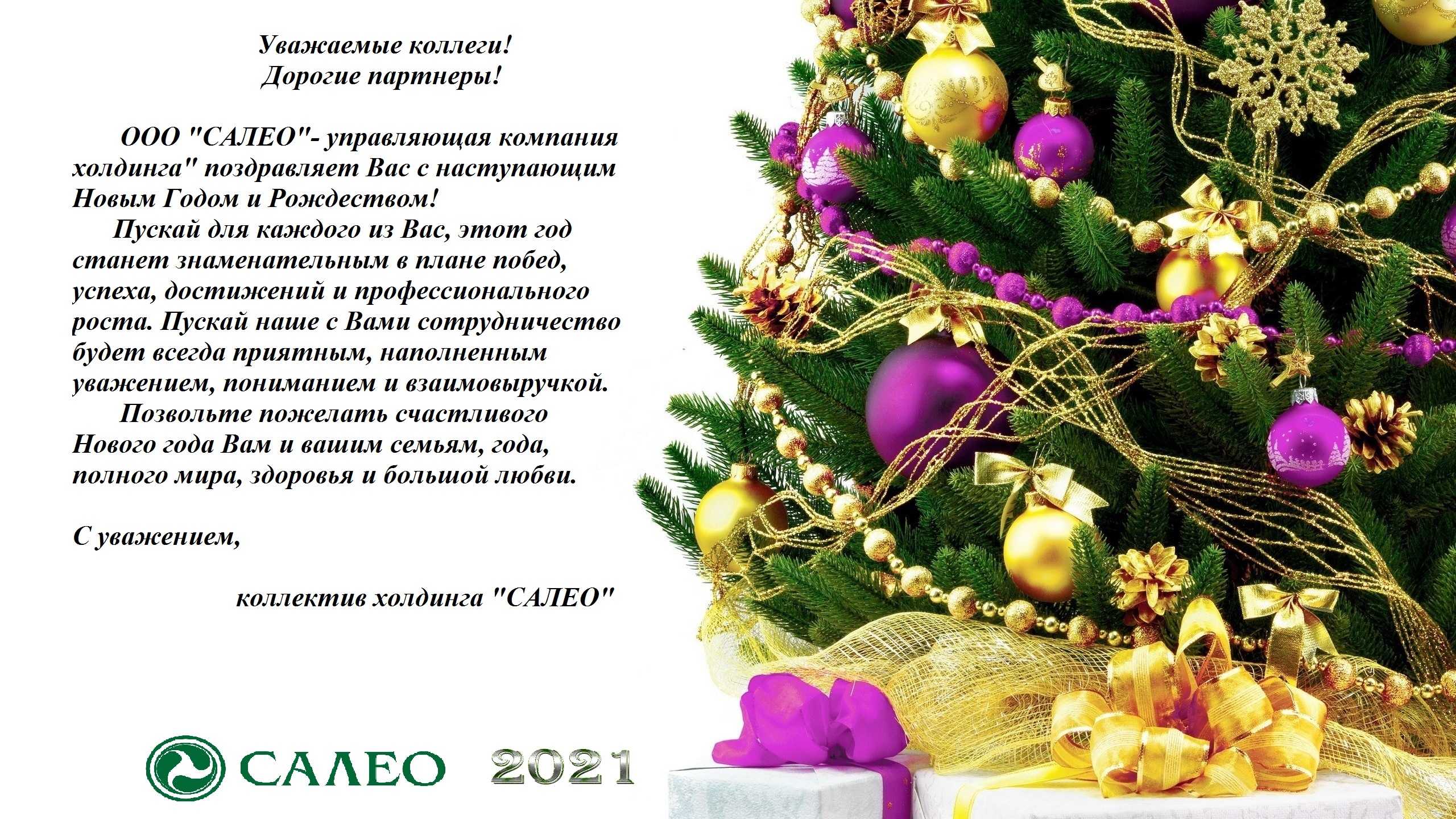 ООО "САЛЕО"- управляющая компания холдинга" поздравляет Вас с наступающим Новым Годом и Рождеством! Пускай для каждого из Вас, этот год станет знаменательным в плане побед, успеха, достижений и профессионального роста. Пускай наше с Вами сотрудничество будет всегда приятным, наполненным уважением, пониманием и взаимовыручкой. Позвольте пожелать счастливого Нового года Вам и вашим семьям, года, полного мира, здоровья и большой любви.
