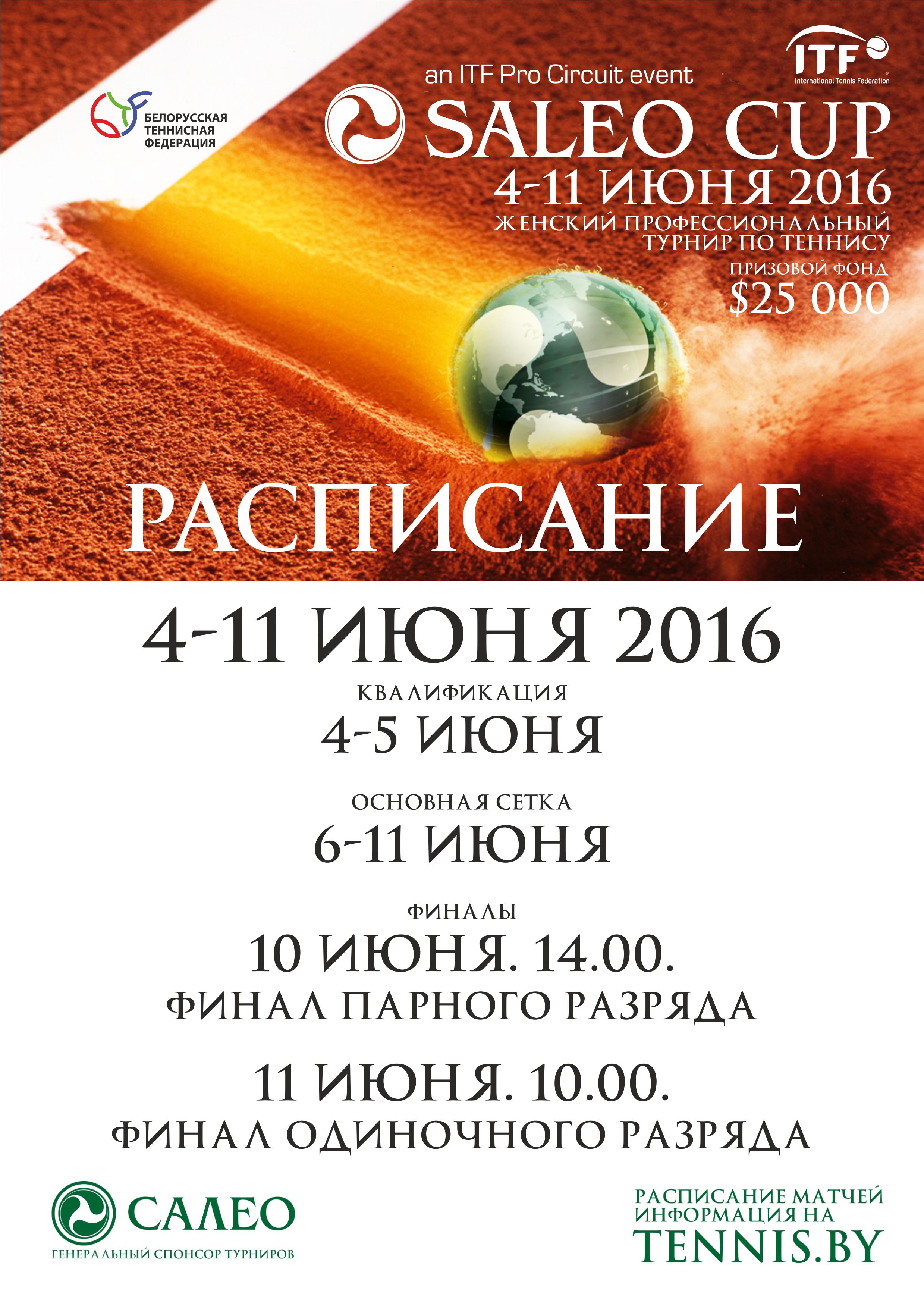 Международный профессиональный теннисный турнир «Saleo Cup» КУБОК САЛЕО (SALEO CUP) Дата проведения: 4-11 июня 2016 Место проведения: г.Минск, ул.Жудро 40, «Городской центр олимпийского резерва по теннису» Начало матчей: 10.00 / Вход свободный 06 июня 2016г.