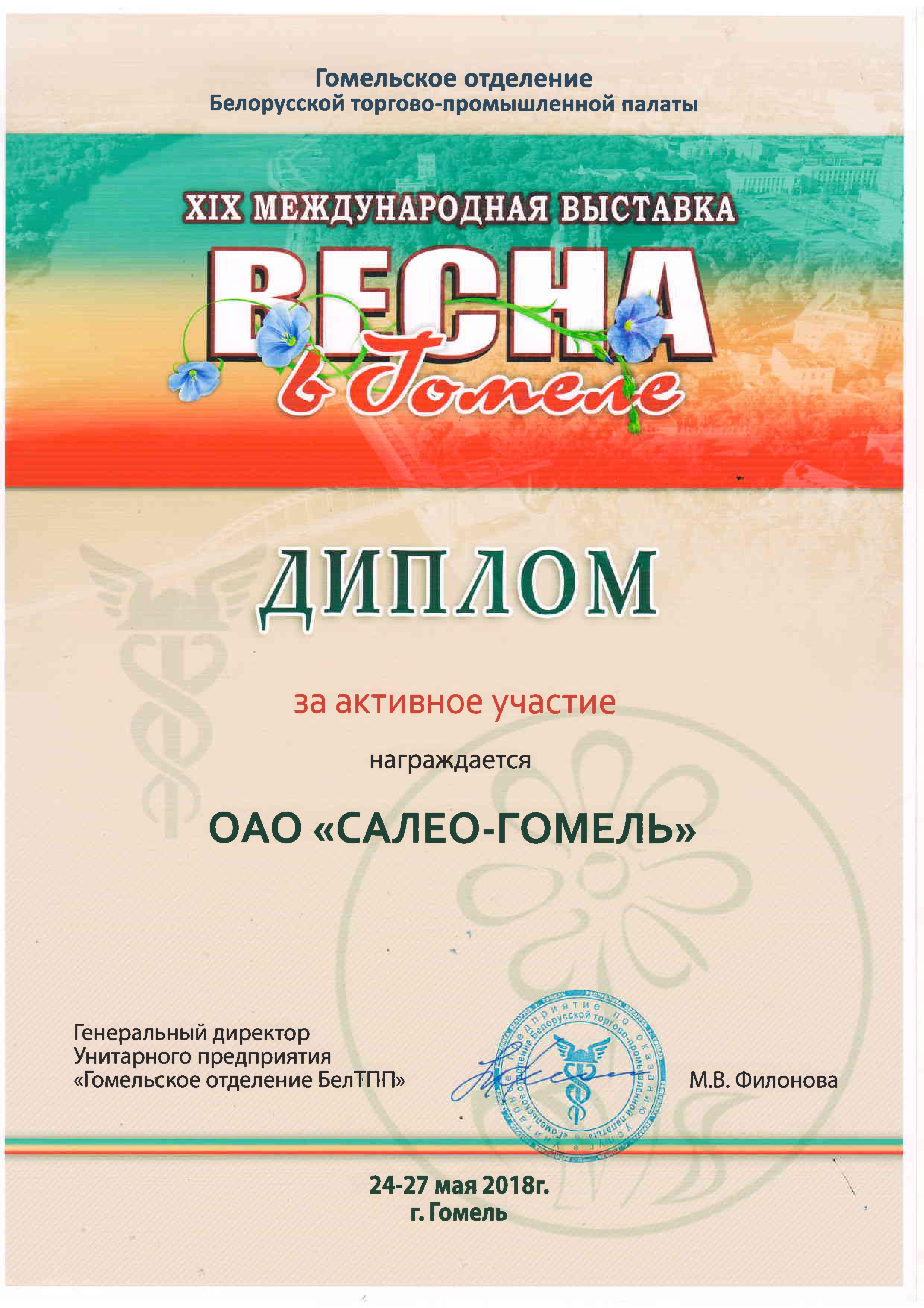 С 24 по 27 мая 2018 года ОАО «САЛЕО-Гомель» приняло участие в работе XIX Международной выставки «Весна в Гомеле» — крупнейшей региональной выставке в Беларуси. В этот раз она прошла во Дворце легкой атлетики и на прилегающих территориях. Выставка была приурочена к проведению Гомельского экономического форума.